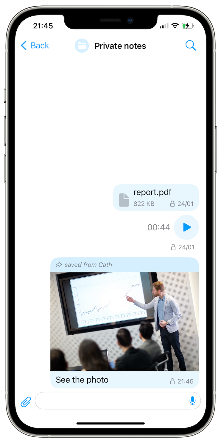 You can now save received messages to private notes and forward them to your contacts and groups. This is both more convenient than copy-pasting the messages, and also more private - you can forward files and preserve a disappearing file in your private notes without saving them outside of the app.