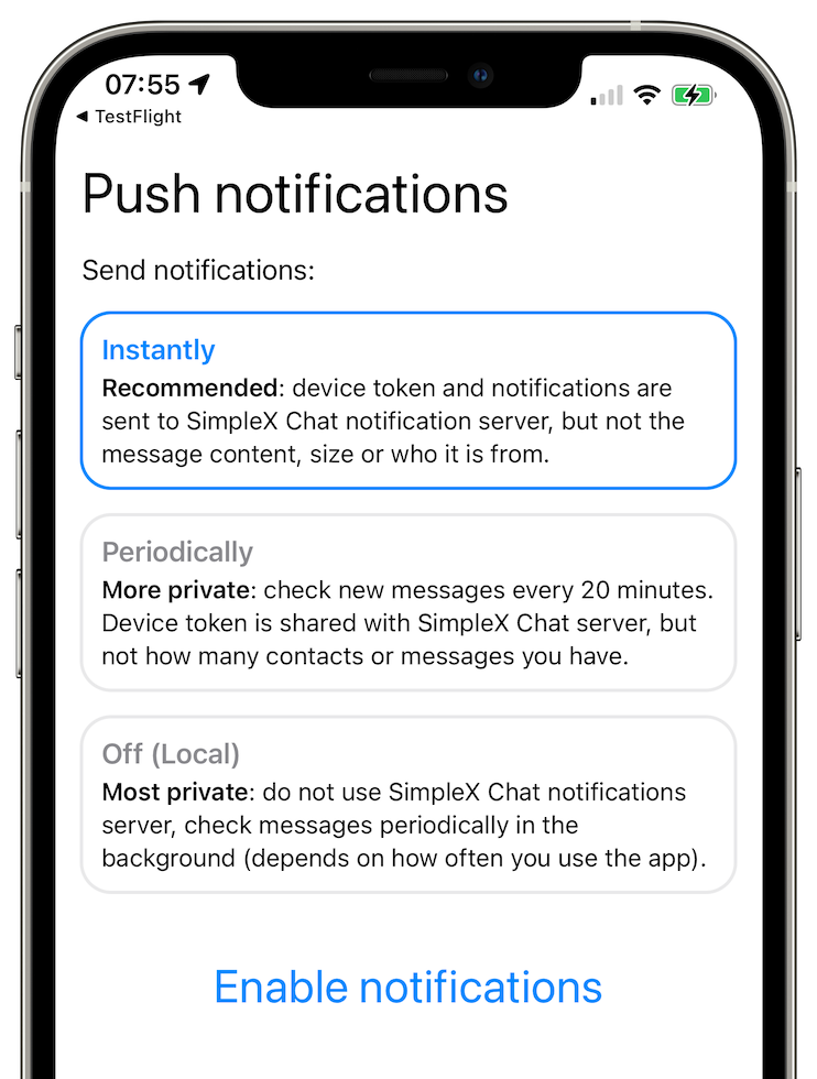 After you have created the chat profile the app will ask you to choose notifications mode.